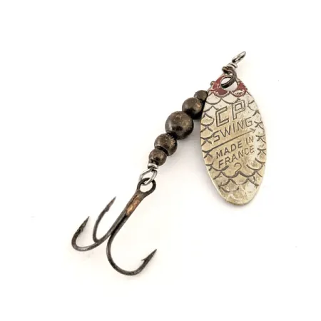 Hopean ja messingin sävyt leimaavat tätä klassista ranskalaista lippaa, joka on taimenen ja ahvenen kalastajien kestosuosikki. Painoltaan 2,7 g (3/32 oz) ja pituudeltaan 4,5 cm (1 3/4") oleva CP-Swing 2 (tuotekoodi 12625) sisältää ikonisen tekstuuripintaisen lehden, johon on selvästi lyöty ranskalainen alkuperämerkintä. Tämän yksilön kuntoluokitus on 5/5, ja siinä on puhdas viimeistely hopeoidussa lehdessä sekä porrastetuissa pronssinvärisissä runkohelmissä. Rakenne koostuu tukevasta keskilangasta ja terävästä kolmihaurakoukusta, noudattaen alkuperäistä mallia. Sen työnjälki heijastaa vuosisadan puolivälin valmistusstandardeja, joiden ansiosta nämä vieheet olivat erittäin arvostettuja kevyessä virvelöinnissä.