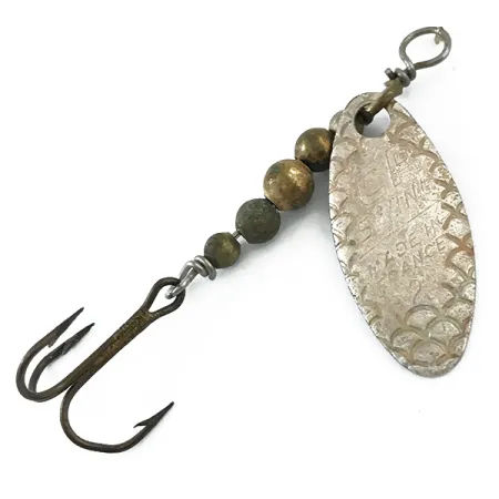 Selvästi kuvioituun hopeanväriseen metalliin leimattu "MADE IN FRANCE" -merkintä lehdessä osoittaa tämän 5 cm CP-Swing 2 -lipan klassisen alkuperän. Painoltaan 2,7 g olevassa mallissa on pisaranmuotoinen lehti, jossa on erottuva suomukuvio – valmistajan varhaisen tuotannon tunnusmerkki tuotekoodilla 5563. Runko koostuu viidestä eri kokoisesta messinkihelmestä, jotka antavat tarvittavan painon kevytlinjaiseen heittokalastukseen. Tämä lippa henkii historiaa metallipintojen pehmeällä, ikääntyneellä olemuksellaan; sen kuntoluokitus on 4/5, ja se on rakenteellisesti täysin kunnossa. Alkuperäinen kolmihaarakoukku on kiinnitetty tukevasti helmien juuressa olevaan lankasilmukkaan. Koon 2 leima on näkyvissä aivan alkuperämaan yläpuolella, mikä viittaa sen erityiseen muotoiluun taimenen tai ahvenen kalastukseen.