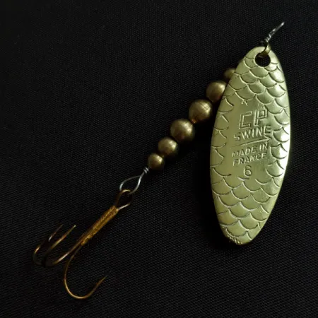 Messinginväriset pinnat leimaavat tätä 1/4 unssin (8 g) lippauistinta, joka on ranskalaisen kalastusvälineteollisuuden ikoninen malli. Lipassa on yksityiskohtainen suomukuvio, joka ympäröi "CP SWING"- ja "MADE IN FRANCE" -leimoja. Näiden merkintöjen alapuolella numero "6" ilmaisee sarjan tarkan mallikoon. Pituudeltaan 7 cm (2 3/4") ylälenkistä koukun mutkaan mitattuna uistimen runkopainona toimii kuusi pallomaista messinkihelmeä. Tämä nimenomainen yksilö, tuotekoodiltaan 20771, on kuntoluokitukseltaan 5/5, mikä osoittaa metallipintojen ja osien säilyneen erinomaisesti. Runko on suora ja päättyy vankkaan kolmihaarakoukkuun.