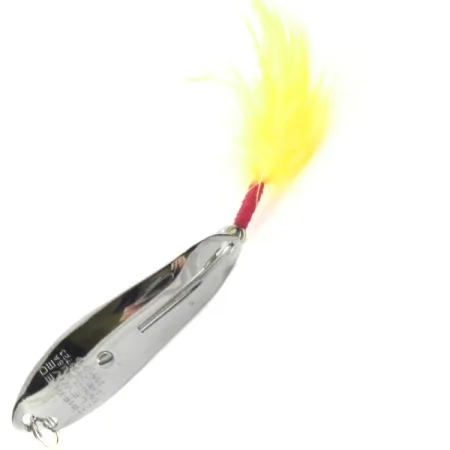 Kiillotettu nikkelipinta heijastaa valoa tässä 6,5 cm (2 1/2") lusikassa korostaen sen erottuvaa ruohosuojattua muotoilua. Painoltaan 12,5 g (2/5 oz) Crippled Alewive -uistimessa on epätavallinen rakenne, johon kuuluu erityinen kiinnitystappi lusikan sisäpuolella. Yksittäiskoukkua suojaa lankainen ruohosuojus, ja se on koristeltu kirkkaankeltaisella höyhen-teaserilla, joka on kiinnitetty tiukalla punaisella lankasidoksella silmukan kohdalta. Metallin koveralla puolella on selvästi nähtävissä stanssattu "CRIPPLED ALEWIVE" -nimi sekä valmistusmaa USA, mikä on merkki vuosisadan puolivälin amerikkalaisesta tuotannosta. Tämä yksilö, tuotekoodiltaan 4138, on 5/5-kunnossa, ja sen pinnoite on erittäin puhdas. Heijastavan rungon ja höyhenperän yhdistelmä on suunniteltu kalastajille, jotka tavoittelevat petokaloja tiheän kasvuston seasta.