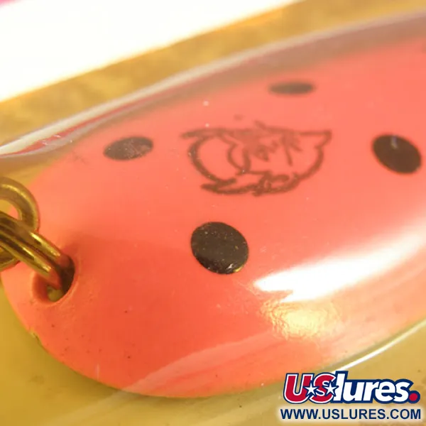 Oranssit ja mustat täplät viimeistelevät tämän vankan 21 g painavan lusikkauistimen. Pituudeltaan 7 cm oleva Eppinger Dardevle (tuotekoodi 0517) on käyttämättömässä kunnossa, säilytettynä alkuperäisessä puna-valkoisessa kuplapakkauksessaan. Pakkauskortti kertoo, että valmistaja on Eppinger MFG. Company Dearbornissa, Michiganissa, jonne yritys muutti vuonna 1959. Lusikan etupuolella näkyy selvästi keskelle stanssattu "Devil Head" -logo, joka on Lou Eppingerin alkuperäisten vuoden 1906 mallien tunnusmerkki. Tukevalla kolmihaarakoukulla ja leveällä koveralla rungolla varustettu uistin on tasapainotettu heitto- tai vetouisteluun. Kirkas oranssi maali ja kontrastiset mustat pisteet ovat tyypillisiä yrityksen vuosisadan aikana kehittämille lukuisille värikuvioille. Jokainen yksityiskohta, omista meistetyistä reunoista korkeakontrastiseen grafiikkaan, heijastaa aikakauden USA:ssa valmistettujen kalastusvälineiden laatua.