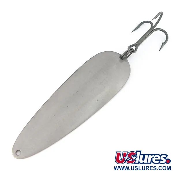Tämä 3 1/2" (9 cm) pituinen klassinen Eppinger-lusikka on merkittävä osa Detroitin kalastushistoriaa. Painoltaan 1oz (28g) oleva viehe on ihanteellinen valinta pitkiin heittoihin tai syvempien vesikerrosten tavoittamiseen. Lusikan takapuolelle on selkeästi leimattu "DARDEVLE" DETROIT. U.S.A., mikä kertoo sen valmistuksesta ennen yrityksen muuttoa Dearborniin vuonna 1959. Tässä nimenomaisessa mallissa, tuotekoodi 10031, on puhdas hopeaviimeistely koko pinnalla, mitä keräilijät ja kalastajat arvostavat sen näkyvyyden vuoksi kirkkaassa vedessä. Metalli on erinomaisessa kunnossa (luokitus 5/5), ja sen pinta on sileä ja hyvin säilynyt. Viehe on varustettu vahvalla kolmihaarakoukulla, joka on kiinnitetty uistinrenkaalla, ja etureunassa on yksi stanssattu reikä siiman kiinnittämistä varten. Kovera pisaraprofiili on Eppingerin omien muottien tulosta, mikä takaa sen erityisen geometrian, joka on tehnyt tästä vieheestä kalastuspakkiien peruspilarin jo yli vuosisadan ajan.
