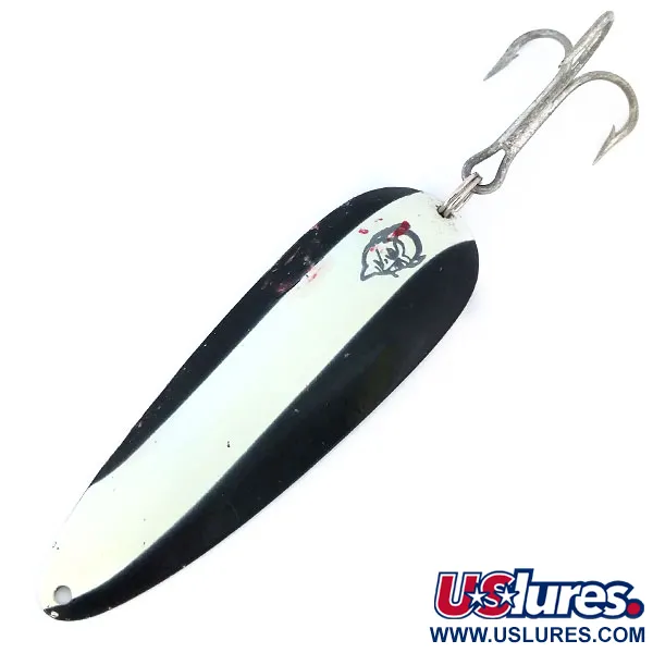 Kääntöpuolen nikkelipinnoite antaa voimakkaan kontrastin tämän 28 g (1 oz) lusikkauistimen etupuolen mustavalkoisille raidoille. Metalliseen takapuoleen on selkeästi meistetty Eppinger- ja Dardevle-merkit, mikä kertoo Lou Eppingerin Detroitin työpajalla vuonna 1906 alkaneesta pitkästä valmistushistoriasta. Tämä 9 cm (3 1/2") pituinen yksilö on varustettu klassisella paholaisenpää-logolla, jonka koveralla puolella on sille ominainen punainen väriyksityiskohta. Tämä kyseinen uistin, tuotekoodi 11016, on 4/5-kunnossa, ja siinä on hyvin säilynyt maalipinta ja puhtaat koukut. Vahva kolmihaarakoukku on kiinnitetty kestävällä uistinrenkaalla, joka on suunniteltu kestämään suurten makean veden petokalojen kalastuksen rasitukset. Kapenevassa päässä oleva yksi siiman kiinnityspiste varmistaa oikeanlaisen liitännän perinteiseen heittokalastukseen tai uisteluun. Voimakaskontrastinen väritys on monipuolinen valinta vaihteleviin vesiolosuhteisiin.