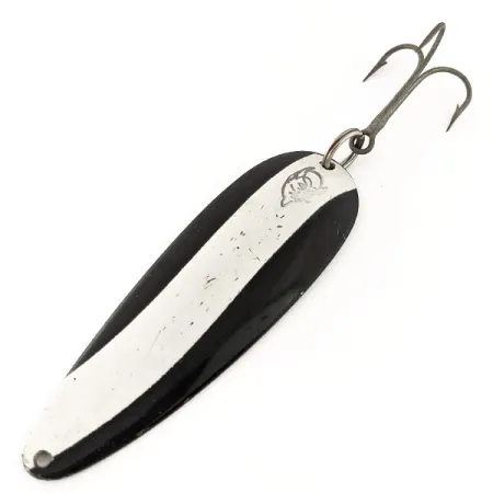Näkyvä mustavalkoinen vinoraita koristaa tämän 28 g (1 oz) Eppinger-klassikon etupuolta. Tämä väriyhdistelmä on monien kokeneiden kalastajien suosiossa sen korkean kontrastin vuoksi vaihtelevissa valo-olosuhteissa. Pituudeltaan 9 cm (3 1/2") oleva Dardevle (tuotekoodi 11461) kantaa etupuolelle metalliin meistettyä ikonista paholaisenpää-logoa, joka on merkki Detroitissa yli vuosisata sitten Lou Eppingerin kellarissa alkaneesta käsityöperinteestä. Kääntöpuolella on puhdas nikkeliviimeistely, johon on selkeästi meistetty 'DARDEVLE'-nimi ja 'MADE IN USA', mikä heijastaa merkin pitkää valmistushistoriaa Michiganissa. Tämä yksilö on 5/5-kunnossa, ja sen maalipinnat ovat terävät ja metalli kiillotettu. Järeä rakenne on yhdistetty vintage-tyyliseen kolmihaarakoukkuun ja kestävään uistinrenkaaseen, ja se on suunniteltu pitkiin heittoihin tai vetouisteluun kohtuullisella nopeudella.