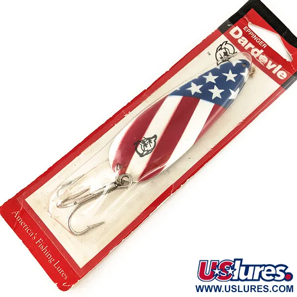 Tämän Eppinger Dardevle -lusikkauistimen isänmaallinen tähtilippukuvio kiinnittää välittömästi huomion esitellen klassista American Flag / Nickel -väritystä. Tämä 1oz (28g) painoinen lusikka on 3 1/2" (9cm) pitkä, ja sen maalattuun pintaan on stanssattu ikoninen paholaisen pää -logo. Kääntöpuolella on kiillotettu nikkeliviimeistely, joka antaa voimakasta välkettä tasaisessa kelauksessa. Eppinger on valmistanut näitä lusikoita Michiganissa vuodesta 1906 lähtien käyttäen omia muottejaan luodakseen mallille ominaisen koveran muodon, joka määrittää sen uinnin. Tuotekoodilla 12441 tunnistettu yksilö on käyttämätön alkuperäisessä puna-valkoisessa pakkauksessaan, ja sen kuntoluokitus on 6. Pakkauksen kääntöpuoli vahvistaa tekniset tiedot "American Flag" -merkinnällä ja tarkalla 28 gramman painolla.