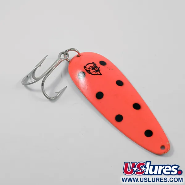 Tämä 28 gramman (1 oz) painoinen vintage-heittolusikka on klassinen osa Detroitin kalastushistoriaa. Etupuolella on erittäin näkyvä kirkkaan vaaleanpunainen viimeistely, jota koristaa seitsemän mustaa pistettä ja Eppingerin ikoninen paholaislogo. Pituudeltaan 9 cm (3 1/2") uistimen kiillotettuun nikkelitaustaan on lyöty leima "DARDEVLE DETROIT USA", mikä takaa sen alkuperän. Tämä tuotekoodilla 2695 kulkeva yksilö on 5/5-kunnossa; kiiltävä emalipinta on säilynyt ja metallin tekstit ovat selkeät. Varustukseen kuuluu vankka kolmihaarakoukku, joka on kiinnitetty kestävällä uistinrenkaalla suurten makean veden petokalojen, kuten hauen tai jättihauen, pyyntiin. Lou Eppingerin kehittämä muotoilu näkyy syvässä koverassa profiilissa, joka on säilynyt lähes muuttumattomana yhtiön alkuajoista lähtien. Kontrasti eloisan vaaleanpunaisen yläpuolen ja heijastavan nikkelitaustan välillä takaa näkyvyyden eri valaistusolosuhteissa.