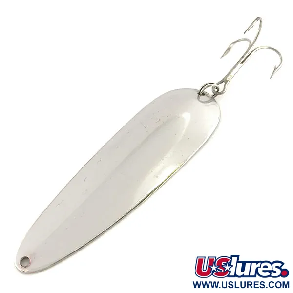 Tämä perinteinen 28 g (1 oz) painoinen lusikkauistin on todellinen työjuhta Eppingerin pajoilta. Kirkas Nikkeli-viimeistely heijastaa valoa upeasti ja korostaa korkealaatuista pinnoitetta, joka teki näistä Detroitissa syntyneistä vieheistä legendaarisia. Koveralta alapuolelta löytyy selkeä "DARDEVLE"-leima sekä "DETROIT. U.S.A." -merkintä, mikä sitoo sen perinnön aikaan ennen yrityksen muuttoa Dearborniin vuonna 1959. Pituudeltaan 9 cm (3 1/2") oleva yksilö, tuotekoodiltaan 9164, on varustettu ikonisella pisaraprofiililla, joka on suunniteltu tuottamaan selkeä vaappuva uinti hitaassa kelauksessa. Varusteet ovat huomattavan kestäviä: vankka kolmihaarakoukku on kiinnitetty järeällä uistinrenkaalla leveämpään peräpäähän. Tämä kyseinen viehe on 5/5-kunnossa, ja sen koko metallirunko on säilynyt peilikirkkaana. Nämä lusikat edustavat yli vuosisadan mittaista amerikkalaista käsityötaitoa, ja niissä käytetään Lou Eppingerin kuuluisia muotteja, joilla luotiin niin tehokkaita työkaluja, että niitä sisällytettiin aikoinaan jopa ilmailun selviytymispakkauksiin.