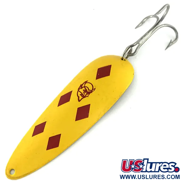 Messinginsävyiseen taustapuolelle selkeästi meistetty 28 g (1 oz) paino ankkuroi tämän klassisen lusikkauistimen. Tässä Eppinger-yksilössä, tuotekoodiltaan 9501, on ikoninen Five of Diamonds -kuvio – kirkkaankeltainen emalipinta, jota koristaa viisi syvänpunaista timanttikuviota ja keskellä oleva tunnistettava paholaisenpää-logo. Lusikan pituus on 9 cm (3 1/2"), ja sen pinta on poikkeuksellisen puhdas, ansaiten 5/5 kuntoluokituksen hyvin säilyneen viimeistelyn ja terävien meistosten ansiosta. Taustapuolelle on syvään painettu 'DARDEVLE'- ja 'EPPINGER'-merkinnät, jotka osoittavat Michiganin Dearbornin tehtaalla käytettyjen muottien tarkkuuden. Koukutus on yhtä vakuuttava: vankka, hopeaviimeistelty kolmihaarakoukku pysyy terävänä ja hapettumattomana. Olipa kyseessä heittokalastus tai uistelu, kovera muoto on suunniteltu hitaaseen kelaukseen, joka tuottaa veteen voimakkaan vaappuvan uinnin. Tämä nimenomainen väritys on pitkään ollut kalastajien valinta kirkkaisiin vesiin, joissa kirkkaankeltainen ja nikkelinvärinen tausta tarjoavat hyvän näkyvyyden.