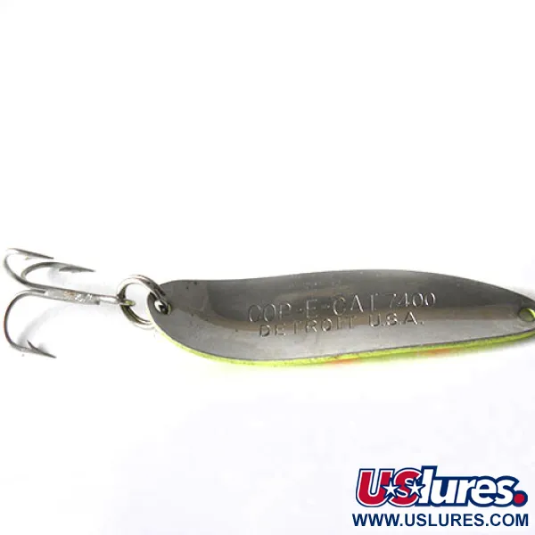 Tämä 1/2 unssia (14 g) painava Eppinger Dardevle Cop-E-Cat on varustettu ikonisella punaisella viiden timantin kuviolla kirkkaan fluoresoivan vihreässä rungossa. Pituudeltaan 2 1/2" (6,5 cm) olevan lusikan keskellä on erehtymätön "Devil"-logo, joka on Lou Eppingerin vuonna 1906 Detroitissa alkaneen perinnön tunnusmerkki. Varustukseen kuuluu tukeva uistinrengas, jossa on terävä kolmihaarakoukku, mikä soveltuu perinteiseen heittokalastukseen tai uisteluun. Tämän nimenomaisen yksilön (tuotekoodi 0165) pinnoite on säilynyt kirkkaana ja tarjoaa hyvän näkyvyyden erilaisissa vesiolosuhteissa. Kovera pinta on suunniteltu tuottamaan selkeästi vaappuva uintiliike tasaisella kelauksella. Valmistettu USA:ssa omilla muoteilla, ja metallirungossa on iän tuomaa pientä kosmeettista kulumista, mikä oikeuttaa kuntoluokitukseen 4/5.