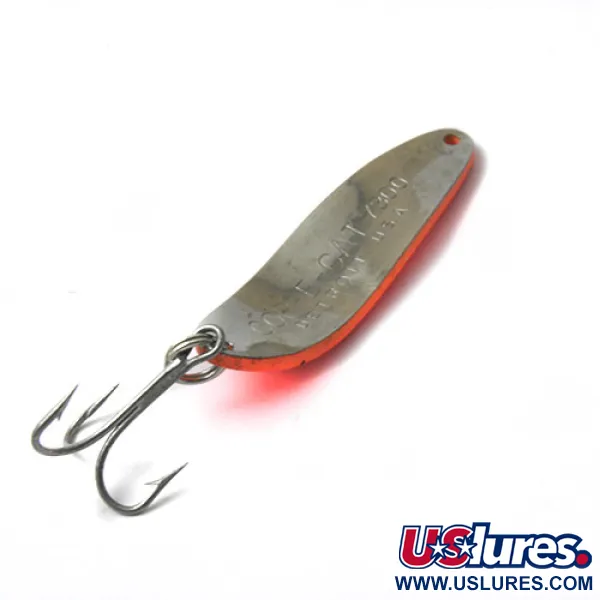 Kuusi selkeää mustaa pistettä on leimattu tämän klassisen amerikkalaisen lusikkauistimen kirkkaaseen oranssiin pintaan. Painoltaan 14 g (1/2 oz) ja pituudeltaan 5,5 cm (2 1/4") oleva Eppinger Dardevle Cop-E-Cat 7300 kantaa ikonista Devil Head -logoa, joka on tunnistanut nämä Michiganista lähtöisin olevat uistimet jo yli vuosisadan ajan. Punaoranssi maali tarjoaa korkean kontrastin, kun taas meistetty metallirunko on suunniteltu monipuoliseen heitto- ja uistelukäyttöön. Tuotekoodilla 0449 tunnistettava uistin on varustettu kestävällä kolmihaarakoukulla ja luotettavalla uistinrenkaalla. Tämä kyseinen yksilö on 4/5-kunnossa, mikä osoittaa Lou Eppingerin alkuperäisten valmistusstandardien kestävyyden. Kovera sisäpinta takaa tarvittavan veden syrjäyttämisen uistimen tunnusomaista uintiliikettä varten vesipatsaassa.