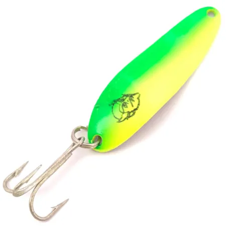 Eloisa chartreuse-liukuväri vaihtuu kirkkaan keltaiseksi tämän 10 g (1/3 oz) painoisen lusikan maalatulla etupuolella. Tämä 5,5 cm (2 1/4") pituinen yksilö, tuotekoodiltaan 3920, on varustettu klassisella UV Glow -viimeistelyllä, joka on tarkoitettu näkyvyyteen syvässä tai sameassa vedessä. Yläosassa on erottuva musta kissanpään leima, joka on Cop-E-Cat-sarjan tunnusmerkki. Vieheen kääntöpuolella kiillotettuun nikkelitaustaan on selvästi lyöty teksti "COP-E-CAT 7300 DETROIT U.S.A.", mikä viittaa yrityksen historiallisiin juuriin Michiganissa ennen muuttoa Dearborniin vuonna 1959. Viehe on erinomaisessa 5/5-kunnossa, ja siinä on kirkas, puhdas pinta ja terävä koukku. Rakenne sisältää kestävän hopeanvärisen kolmikoukun, joka on kiinnitetty luotettavalla uistinrenkaalla, valmiina heittelyyn tai uisteluun. Kovera rungon muoto on Eppingerin muotoilun tavaramerkki, joka on suunniteltu tarjoamaan vakaa uinti vesipatsaassa samalla kun fluoresoiva maali reagoi käytettävissä olevaan valoon.
