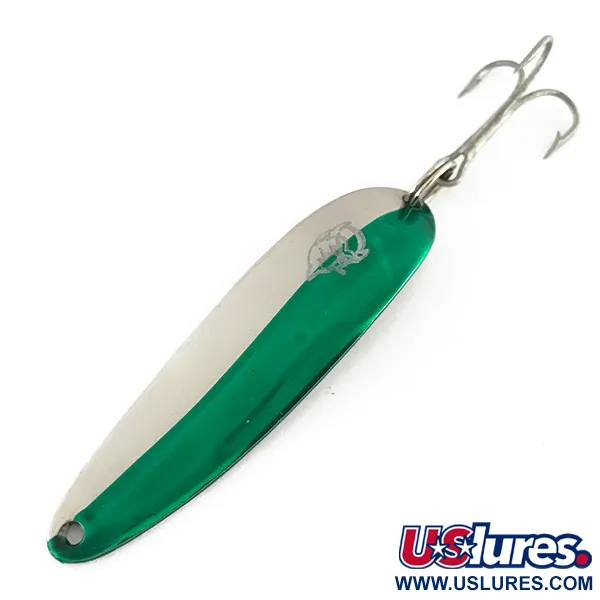 Silmiinpistävä diagonaalinen jako kiillotetun nikkelin ja läpikuultavan vihreän välillä määrittelee tämän mallin ulkonäön. Painoltaan 14 g (1/2 oz) oleva Eppinger Dardevle Cop-E-Cat 7400 on klassinen edustaja Detroitin kalastusperinteestä. Lusikan takapuolella on selkeästi nähtävissä leimatut merkinnät "COP-E-CAT 7400" ja "DETROIT U.S.A.", jotka ankkuroivat sen historian merkin alkuperäisille juurille Michiganiin. Pituudeltaan 6,5 cm (2 1/2") olevassa uistimessa on ikoninen paholaisen pää -logo syövytettynä metallin vihreäksi sävytettyyn puoleen. Vahva kolmihaarakoukku on kiinnitetty tukevasti uistinrenkaalla perään, mikä tekee siitä sopivan sekä heittokalastukseen että uisteluun. Tämä yksilö, tuotekoodiltaan 8392, on kunnoltaan 5/5, ja siinä on hyvin säilyneelle keräilykohteelle ominaiset kirkkaat heijastukset ja puhtaat pinnat. Rungon kovera muoto on Eppingerin suunnittelufilosofian kulmakivi, joka sai alkunsa Lou Eppingerin kellarissa vuonna 1906.