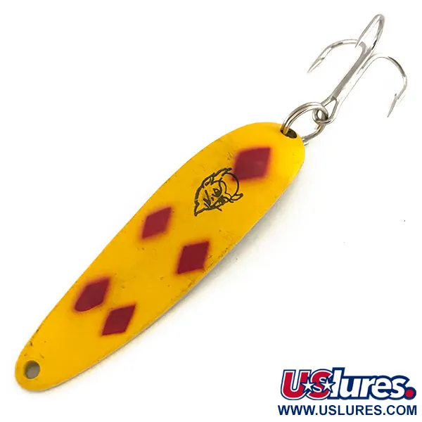 Messinginväriseen kääntöpuoleen selvästi leimattu "COP-E-CAT 7400 DETROIT U.S.A." sitoo tämän 14 gramman lusikan sen Michigan-perintöön. Tässä nimenomaisessa Eppinger Dardevle Cop-E-Cat 7400 -mallissa, tuotekoodiltaan 9166, on klassinen Five of Diamonds -viimeistely: kirkkaankeltainen etupuoli, jota koristaa viisi punaista timantti- eli ruutukuviota. Etupinnassa on myös tunnistettava musta pirunpää-logo, joka on Lou Eppingerin vuonna 1906 Detroitissa tapahtuvan perustamisen symboli. Pituudeltaan 6,5 cm uistimessa on pitkänomainen ja kovera runko, joka on suunniteltu heittokalastukseen ja uisteluun. Tämä yksilö on erinomaisessa kunnossa (arvosana 5/5); maalipinta on puhdas ja metallinen kääntöpuoli on kirkas sekä hyvin säilynyt. Siinä on edelleen alkuperäiset uistinrengas ja kolmihaarakoukku, mikä heijastaa 1900-luvun puolivälin amerikkalaisten kalastusvälineiden laatua.