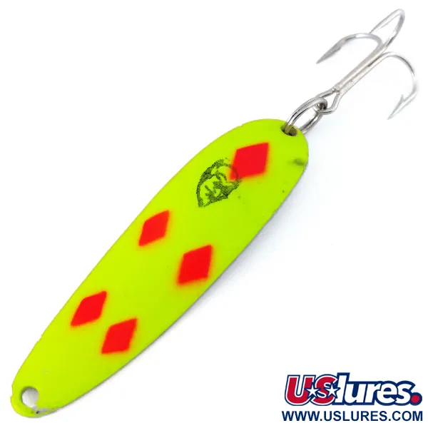 Kirkas fluoresoiva keltainen pinnoite muodostaa pohjan tälle metalliselle lusikkauistimelle, jossa on legendaarinen, eloisan punainen Five of Diamonds -kuvio. Tämä 1/2 oz (14 g) painava ja 2 1/2" (6,5 cm) pitkä Eppinger Dardevle Cop-E-Cat 7400 UV on valmistettu Lou Eppingerin Michiganissa tunnetuksi tekemillä alkuperäisillä muoteilla. Näkyvää viimeistelyä on tehostettu UV-reaktiivisella hohdolla, mikä tekee vieheestä erottuvan hämärässä tai syvemmässä vedessä. Yläosassa on klassinen "Devil"-pääleima, merkki USA-valmisteisesta laadusta, jota Eppinger on vaalinut vuodesta 1906 lähtien. Tämä yksilö on erinomaisessa kunnossa (5/5), ja siinä on alkuperäiset uistinrenkaat sekä terävä kolmihaarakoukku. Tuotekoodilla 10817 tunnistettava lusikka hyödyntää koveraa, pitkänomaista muotoaan luodakseen tietynlaisen uintiliikkeen tasaisessa kelauksessa.