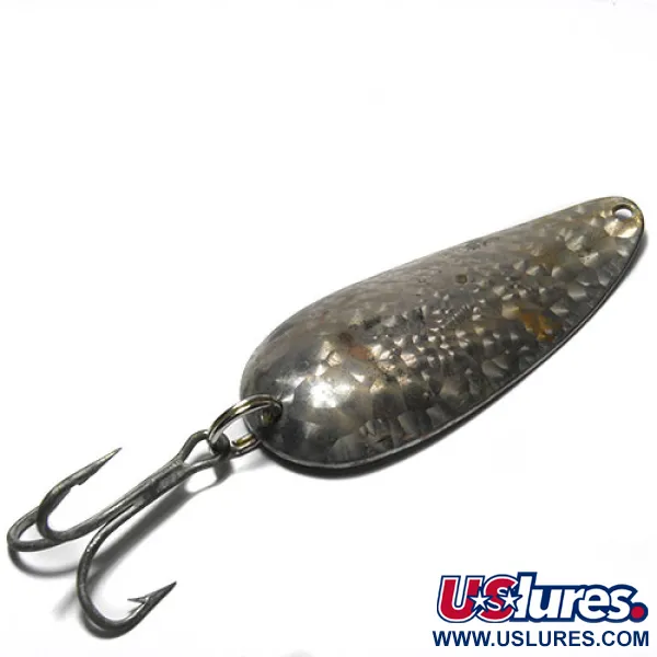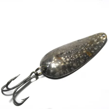 Vasaroitu, suomukuvioinen hopeaviimeistely välkehtii tässä 3 tuuman (7,5 cm) Eppinger-lusikassa, jonka mallia on valmistettu yrityksen omilla muoteilla aina Michiganin alkuajoista lähtien. Tämä yksilö, tuotekoodiltaan 0305, on väritykseltään Crystal (Scale Silver), mikä tarjoaa monivivahteisen heijastuksen vedessä verrattuna tavallisiin sileisiin lusikkauistimiin. Klassinen Dardevlet-nimi on selkeästi meistetty uistimen koveraan vatsaan, mikä takaa sen aitouden ja amerikkalaisen perinnön. Kunnossa 4/5 metallipinnat ovat säilyneet kirkkaina, ja alkuperäinen kolmihaarakoukku on tukevasti kiinni vahvassa uistinrenkaassa. Pitkänomainen muoto ja syvä profiili on suunniteltu Eppingerillä luomaan erottuva vaappuva uintiliike tasaisella kelauksella. Kirkkaissa vesissä nikkelinvärinen tausta ja suomukuvioinen etuosa toimivat luonnollisena esityksenä petokaloille. Kapean pään siimakiinnityspisteessä on vain vähäistä kulumista, mikä osoittaa, että tästä vieheestä on pidetty hyvää huolta keräilijän pakkauksessa.