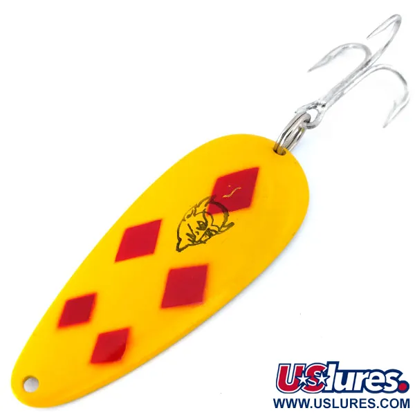 Viisi punaista ruutua kirkkaankeltaisella pohjalla muodostavat tämän klassikkomallin ikonisen kuvion. Vieheen pituus on 7 cm (2 3/4") ja paino 21 g (3/4 oz), mikä tekee siitä vakuuttavan valinnon heittokalastukseen tai uisteluun. Lusikan kääntöpuolelta löytyy klassinen "DARDEVLET" DETROIT U.S.A. -leima painettuna kultapintaiseen metalliin. Alkuperäinen hopeanvärinen kolmihaarakoukku on kiinnitetty tukevasti vahvalla uistinrenkaalla. Musta pirunpää-logo sijaitsee ruutujen keskellä, mikä on ollut Eppingerin käsityötaidon tavaramerkki siitä lähtien, kun Lou Eppinger alkoi valmistaa näitä käsin Detroitin kellarissaan yli vuosisata sitten. Kuntoluokitukseltaan 6 oleva yksilö on käyttämätön, ja sen viimeistely sekä osat ovat täysin ehjiä. Tuote on luetteloitu koodilla 10816. Lusikan kovera muoto saa aikaan sille ominaisen vaappuvan liikkeen kelattaessa – muotoilu on niin tehokas, että se kuului aikoinaan jopa sotilasilmailun selviytymispakkauksiin.