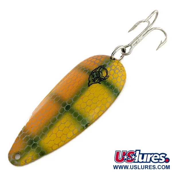 Tämä vintage-lusikkauistin, jossa on keltainen ja vihreä suomukuvio oranssilla pohjalla, on loistava esimerkki käsityötaidosta, joka teki Detroitista kalastusvälineiden innovaatiokeskuksen. 7 cm (2 3/4") Eppinger Dardevle Dardevlet kantaa ikonista mustaa paholaisenpää-logoa etupuolellaan, mikä on tunnusmerkki sekä keräilijöille että haukea tai lohta tavoitteleville kalastajille. Painoltaan 19 g (2/3 oz) uistimessa on kovera metallirunko, jonka kääntöpuoli on kiillotettua nikkeliä. Taustapuolelle on stanssattu DARDEVLET ja DETROIT, U.S.A., mikä kertoo valmistushistoriasta ennen yrityksen muuttoa vuonna 1959. Tämä yksilö, tuotekoodiltaan 11798, on erinomaisessa kunnossa (arvosana 5/5), ja siinä on kirkas maalipinta sekä puhdas metallipinta. Uistin on varustettu tukevalla kolmihaarakoukulla, joka on kiinnitetty uistinrenkaalla, ja se soveltuu monipuolisesti heitto- ja uistelukalastukseen.