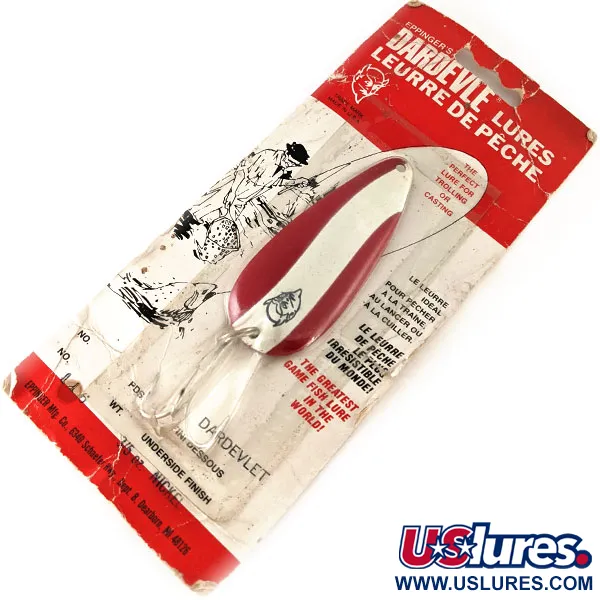 Punaiset ja valkoiset raidat peittävät tämän 21 g (3/4 oz) lusikan etupuolen, luoden korkean kontrastin kuvion, joka on määritellyt Eppingerin tuotantoa vuosikymmeniä. Tämä 7 cm (2 3/4") pitkä Dardevlet-malli on varustettu kiillotetulla nikkeliviimeistelyllä takapuolella ja ikonisella, etupuolelle stanssatulla imp-logolla. Tämä nimenomainen yksilö (tuotekoodi 12437) on käyttämätön ja säilynyt alkuperäisessä vintage-pakkauksessaan, joka korostaa sen soveltuvuutta sekä uisteluun että heittokalastukseen. Käsityö perustuu samaan paksun kaliiperin metalliin ja omiin muotteihin, jotka Lou Eppinger teki tunnetuksi Michiganissa, varmistaen petokalojen vaatiman kestävyyden. Pakkauksen grafiikat ovat säilyneet terävinä, ja ne mainostavat sitä huippuvaihtoehtona moniin olosuhteisiin. Jokainen komponentti uistinrenkaasta emaliviimeistelyyn on puhdas ja heijastaa amerikkalaisen kalastusvälineperinnön laatua.