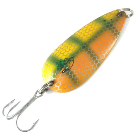 Tämän vintage-Eppinger Dardevlet -lusikan estetiikan määrittelevät kirkkaanvihreät pystyraidat kelta-oranssia hunajakennotaustaa vasten. Taakse on lyöty leima 'DARDEVLET DETROIT USA', mikä tarkoittaa, että tämä 7 cm (2 3/4") yksilö on valmistettu ennen merkin muuttoa Dearborniin vuonna 1959. Painoa vieheellä on vankat 21 g (3/4 oz). Tuotekoodi 3695 yksilöi lusikan, joka on 5/5-kunnossa ja jonka koveralla sisäpinnalla on puhdas nikkeliviimeistely. Sen pitkänomainen muoto ja omintakeinen rakenne on suunniteltu luomaan vaappuva uintiliike hitaassa kelauksessa. Tämä Yhdysvalloissa valmistettu lusikkauistin on varustettu alkuperäisellä kolmihaarakoukulla ja uistinrenkailla, mikä kertoo laadusta, jonka ansiosta Dardevle-vieheitä sisällytettiin jopa ilmavoimien selviytymispakkauksiin. Keräilijät arvostavat Detroit-leiman selkeyttä, joka korostaa sen varhaista valmistushistoriaa. Pienet vavan kärjen liikkeet kelauksen aikana saavat aikaan väreilyn, joka laukaisee usein uteliaiden petokalojen iskun.