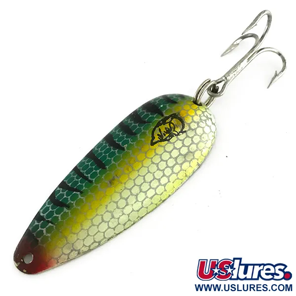 Messinginväriseen kääntöpuoleen on selkeästi meistetty nimi "DARDEVLET" sekä alkuperäpaikka "DEARBORN MI" ja painomerkintä "3/4 OZ.". Tässä 21 g (3/4 oz) painoisessa lusikassa on tunnusomainen Ahven-kuviointi, joka on toteutettu suomumaisella kennorakenteella kirkkaan keltaisen ja vihreän värisiirtymän päälle. Tummat pystyraidat luovat realistisen kontrastin, ja kärjessä lähellä siimalenkkiä on hienovarainen punainen tehoste. Etupuolella näkyy selvästi ikoninen musta pirunpää-logo, joka on ollut Eppinger-merkin tunnus jo vuodesta 1906 lähtien. Vieheen pituus on 7 cm (2 3/4"), ja siinä on vankka kolmihaarakoukku, joka on kiinnitetty takapäähän uistinrenkaalla. Tämä tuotekoodilla 8442 tunnistettu yksilö on poikkeuksellisessa kunnossa ja on saanut 5/5-luokituksen puhtaista pinnoistaan ja terävistä meistoksistaan. Koska Eppinger siirsi tuotantonsa Dearborniin vuonna 1959, tämä uistin on merkittävä osa Michiganin kalastushistoriaa. Se on valmistettu messingistä ja sen painotettu profiili on suunniteltu heittokalastukseen ja uisteluun eri olosuhteissa.