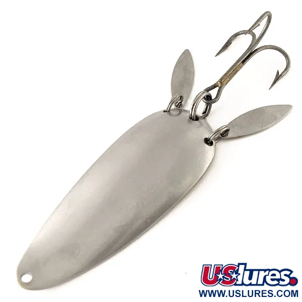 Tämä 21 g painava, paksusta metallista valmistettu lusikkauistin on edelleen merkittävä löytö kaikille Michiganissa valmistettuihin kalastusvälineisiin erikoistuneille keräilijöille. Tämän Dardevlet Klicker -mallin tunnusmerkki on kaksi pientä, pisaranmuotoista metallilevyä, jotka on kiinnitetty takapuolen uistinrenkaaseen kolmihaarakoukun rinnalle. Nämä levyt osuvat uistimen runkoon kelauksen aikana luoden mekaanisen naksahduksen, joka täydentää hopeanvärisen pinnan visuaalista välkettä. Kääntöpuolella on selkeä, syvään stanssattu teksti, joka tunnistaa sen aidoksi "DARDEVLET"-uistimeksi "DETROIT U.S.A." -merkinnällä, mikä osoittaa sen valmistetun ennen Eppingerin muuttoa Dearborniin vuonna 1959. Pituudeltaan 7 cm oleva ja tuotekoodilla 12300 varustettu yksilö on säilynyt erinomaisesti. Kiillotettu hopeapinta on vapaa merkittävistä virheistä tai hapettumisesta, mikä vastaa 5/5-kuntoa. Tukeva kolmihaarakoukku on kiinnitetty vahvalla uistinrenkaalla, valmiina heittokalastukseen tai uisteluun, jossa tarvitaan välkkeen ja äänen yhdistelmää.