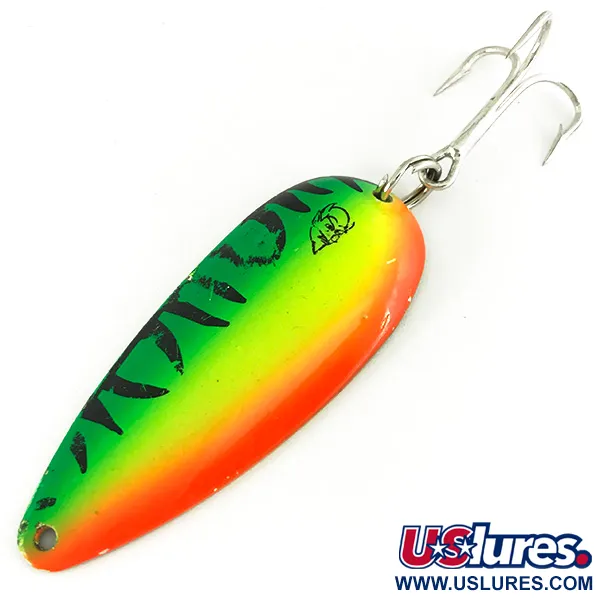 Tämä 21 g (3/4 oz) painava meistetty metallinen lusikkauistin on viimeistelty kylläisellä Fire Tiger -värityksellä, joka on suunniteltu erittäin näkyväksi. Tämä Dardevlet UV -malli, tuotekoodi 7211, on pituudeltaan 7 cm (2 3/4") ja siinä on meistetty paholaisenpää-logo ylemmän uistinrenkaan lähellä. Eppingerin USA:ssa valmistama uistin noudattaa klassista koveraa muotoa, joka on määrittänyt merkkiä Lou Eppingerin Detroitin ajoista lähtien. Fluoresoiva maali reagoi UV-valoon, mikä on moderni päivitys klassiseen lusikkaan syvissä tai sateisissa vesissä kalastamiseen. Varustukseen kuuluu vankka uistinrengas ja terävä kolmihaarakoukku, ja kuntoarvio on 5/5. Keräilijät huomioivat selkeät rajat vihreän, keltaisen ja oranssin sävyjen välillä sekä voimakkaat mustat tiikeriraidat. Kääntöpuoli on viimeistelemätön, vastaten Dearbornin tehtaan tuotantostandardeja.