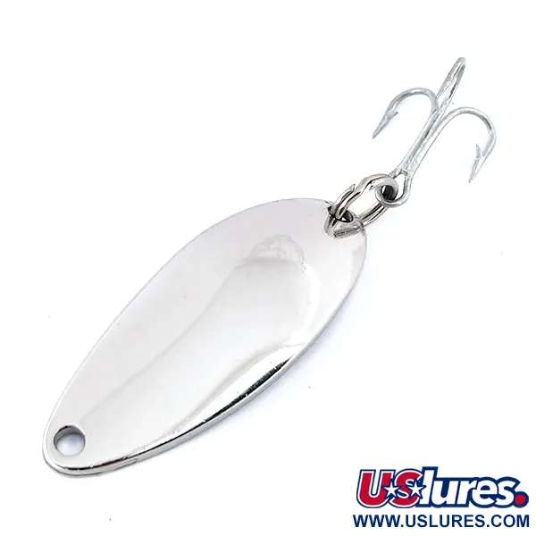 Korkeakiiltoinen nikkeliviimeistely määrittelee tämän klassisen lusikkauistimen ulkonäön ja tarjoaa erinomaisen näkyvyyden kirkkaissa vesissä. Tämä Eppinger Dardevle Devle Dog 5200, tuotekoodiltaan 10682, painaa 1/4 unssia (7g) ja on pituudeltaan 1 1/2 tuumaa (4cm). Uistimen kääntöpuolella on syvä leima 'DEVLE-DOG 5200 DETROIT U.S.A.', joka osoittaa sen alkuperän ja Lou Eppingerin Michiganissa vuonna 1906 alkaneen käsityöperinnön. Pitkänomainen, kovera runko on suunniteltu heijastamaan valoa, ja siihen on yhdistetty hopeanvärinen kolmihaarakoukku. Kuntoluokitukseltaan 5/5 oleva yksilö on säilyttänyt kirkkaan, peilimäisen pintansa ja terävät koukun kärjet. Tässä sarjassa käytetään Eppingerin omia muotteja, mikä varmistaa, että perinteinen muoto pysyy samana kuin uistimissa, joita on käytetty selviytymispakkauksissa ja pakissa sukupolvien ajan. Hopeanvärinen kolmihaarakoukku on kiinnitetty uistimen perään kestävällä uistinrenkaalla.