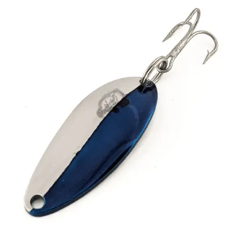 Eloisa Nickel / Blue -viimeistely määrittää tämän vintage-tyylisen Dardevle Devle Dog 5200 -uistimen etupuolta, keräten valoa juuri Lou Eppingerin tarkoittamalla tavalla. Tässä 1 1/2" (4 cm) pitkässä lusikassa on ikoninen kovera, pitkänomainen runko, joka on tehnyt merkistä perusvarusteen sen Detroitin ajoista, vuodesta 1906 lähtien. Tämä nimenomainen uistin, tuotekoodi 12652, painaa 1/4 unssia (7 g), ja sen kääntöpuolelle on leimattu Dearborn, MI -osoite, mikä kertoo sen valmistuksesta yrityksen vuonna 1959 tapahtuuneen muuton jälkeen. Taustapuoli on puhdas ja kirkas, ja siinä näkyy selvästi mallin nimi ja sijainti. Varustukseen kuuluu vankka uistinrengas ja alkuperäinen hopeanvärinen kolmihaarainen koukku. Tämä yksilö on käyttämätön ja näyttää yhtä tuoreelta ja hyvin säilyneeltä kuin se olisi vasta poistettu myyntikortista. Suunniteltu heitto- tai vetouisteluun, ja paksu metallirunko varmistaa, että uistin säilyttää syvyytensä hitaammassakin kelauksessa.
