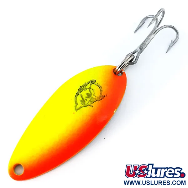 Tämän 7g (1/4oz) painoisen lusikkauistimen metallirungossa on eloisa väriliuku aurinkoisen keltaisesta syvään, tuliseen oranssinpunaiseen. Pinnassa näkyy selkeästi mustalla musteella painettu Dardevlen ikoninen "Devil Head" -leima lähellä 4cm (1 1/2") rungon keskiosaa. Koska tämä Devle Dog 5200 (tuotekoodi 10819) on käyttämätön, sen viimeistely on virheetön ja alkuperäinen kiilto on tallella. Tämä erityinen malli on viimeistelty fluoresoivalla pinnoitteella, joka reagoi voimakkaasti UV-valoon muuttaen päivänvalon värit silmiinpistäväksi neongreun ja oranssin hehkuksi. Se on kiehtova tekninen lisäys merkkiperintöön, jonka Lou Eppinger aloitti Detroitissa jo vuonna 1906. Taustapuoli on kiillotettua nikkeliä, mikä on perinteinen valinta maksimoimaan välke valon osuessa metalliin. Varustukseen kuuluu terävä kolmihaarakoukku, joka on kiinnitetty vahvalla uistinrenkaalla, ja se soveltuu niin heittokalastukseen eri syvyyksillä kuin hallittuun vetouisteluun. Toisin kuin perinteinen leveärunkoinen Dardevle, Devle Dog tarjoaa virtaviivaisemman profiilin, joka on houkutteleva kohde hauelle tai taimenelle.