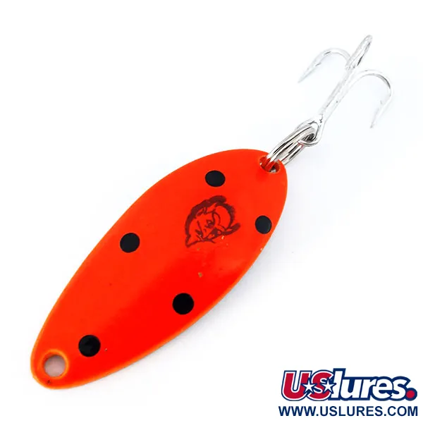 Kiillotettu nikkeli peittää tämän 4 cm pitkän lusikkauistimen taustapuolen, tarjoten kirkkaan metallisen välkkeen, joka täydentää rohkeasti maalattua etupuolta. Tuotekoodilla 10931 varustettu Devle Dog 5200 UV on viimeistelty erittäin erottuvalla fluoresoivalla punaisella, ja viisi selkeää mustaa pistettä ympäröivät klassista Eppinger-paholaisenpääleimaa. Painoltaan 7 g painava metallirunko on suunniteltu tasapainoisiin heittoihin ja kestävyyteen. Vieheen viimeistely on UV-reaktiivinen, muuttuen syvän hehkuvaksi oranssinpunaiseksi ultraviolettivalossa, mikä parantaa näkyvyyttä sameassa vedessä tai hämärässä. Terävä, hopeanhohtoinen kolmihaarakoukku on kiinnitetty tukevalla uistinrenkaalla takareunaan, ja kärjessä on siisti silmukka siiman kiinnitystä varten. Tämä yksilö on käyttämätön ja täysin samassa kunnossa kuin se oli lähtiessään Michiganin tehtaalta.