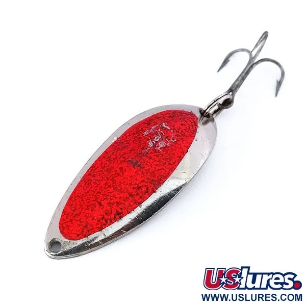 Tämä 18 g (2/3 oz) painava perinteinen lusikkauistin on erinomainen esimerkki Lou Eppingerin legendaarisesta detroitilaisesta käsityöstä. Etupuolella on kirkkaanpunainen pintakuvioitu viimeistely kiillotetun nikkelipohjan päällä – suuren kontrastin yhdistelmä, joka on suunniteltu näkyvyyttä varten. Tämän 5,5 cm (2 1/4") pituisen vieheen hopeanvärisestä koverasta kääntöpuolelta löytyy selkeä "DEVLE-DOG 5400 DETROIT U.S.A." -leima, joka osoittaa sen valmistetun ennen yrityksen muuttoa Dearborniin vuonna 1959. Valmistettu Yhdysvalloissa omilla muoteilla, ja varustukseen kuuluu uistinrenkaalla kiinnitetty vahva kolmihaarakoukku. Tällä nimenomaisella vieheellä (tuotekoodi 10451) on erittäin puhdas pinta ja kirkas metalli, saavuttaen kuntoluokituksen 5/5. Pitkänomainen muoto ja painotettu runko on suunniteltu erityisesti heittopituutta ja vakautta silmällä pitäen tasaisessa kelauksessa.