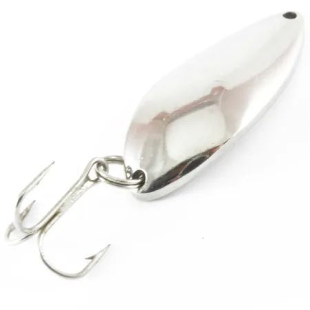 Tämä 18 g painava lusikkauistin on kiillotettu peilimäiseksi nikkelipinnaksi, ja siihen on lyöty klassinen "DEVLE DOG 5400 DETROIT U.S.A." -leima syvälle metalliin. Pituudeltaan 5,5 cm oleva Eppinger Dardevle Devle Dog 5400 (tuotekoodi 3710) edustaa Michiganin kalastusperintöä ajalta ennen yrityksen muuttoa Dearborniin vuonna 1959. Paksu metallirakenne on yhdistetty terävään kolmihaarakoukkuun tukevan uistinrenkaan avulla, mikä tekee siitä luotettavan valinnan pitkiin heittoihin ja vetouisteluun. Tämä yksilö on säilynyt erinomaisesti (kuntoluokitus 5/5), sen pinta on poikkeuksellisen puhdas ja leima selkeästi luettavissa. Rungon pitkänomainen ja kovera muoto on tyypillinen Devle Dog -mallille, ja se on suunniteltu pysymään vakaana vedettäessä vesipatsaan läpi. Lou Eppingerin varhainen Detroitissa alkanut valmistushistoria näkyy selvästi tässä vintage-lusikan käsityössä.