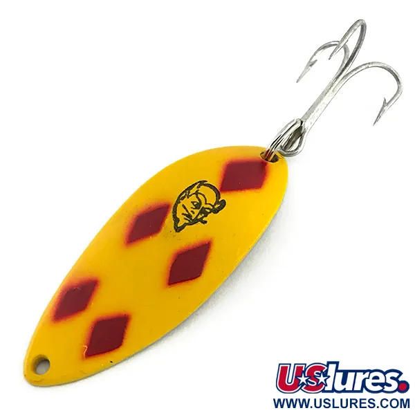Tämän kappaleen kiillotettuun messinkitaustaan on meistetty sanat "DEVLE DOG 5400" ja "DETROIT U.S.A.", mikä on selvä kunnianosoitus Eppinger Manufacturingin juurille Michiganissa. Tämä 5,5 cm (2 1/4") pituinen ja 14 g (1/2 oz) painoinen lusikkauistin on varustettu ikonisella Five of Diamonds -kuviolla: viisi selkeää punaista timanttia, jotka on asetettu tarkasti eloisalle keltaiselle pohjalle. Perinteinen musta paholaisenpää-logo on painettu terävästi etupuolelle, mikä on Lou Eppingerin vuonna 1906 perustaman merkin tunnusmerkki. Tämä vintage-tuote, tuotekoodiltaan 8724, on käyttämätön ja säilyttänyt alkuperäisen loistonsa ja kirkkaan maalipintansa. Rakenteeseen kuuluu tukeva hopeanvärinen kolmihaarakoukku, joka on kiinnitetty uistinrenkaalla takapäähän, sekä valmiiksi porattu siimalenkki päädyssä. Sen kovera, soikea muoto on tulosta Yhdysvalloissa käytetyistä valmistusmuoteista, ja se on suunniteltu erityisesti heittokalastukseen tai uisteluun.