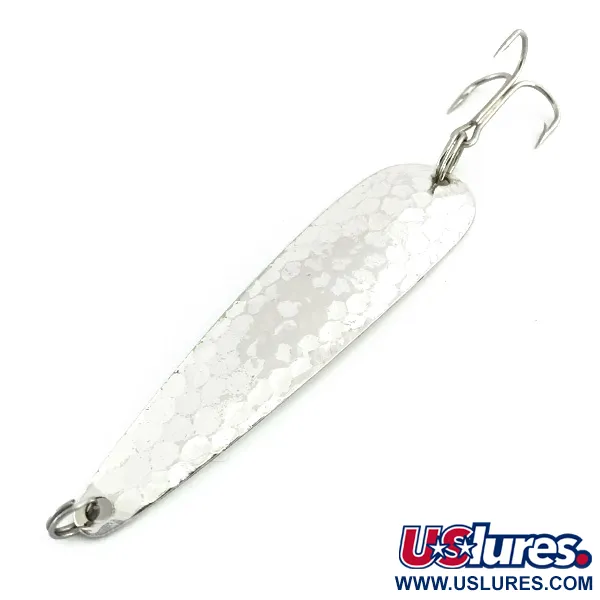Vasaroitu hopeapinta luo teksturoidun, valoa heijastavan pinnan tämän uisteluspesialistin runkoon. Painoltaan 1/4 oz (8 g) Flutter-Chuck 3500 on Eppinger-erikoismalli, joka hyödyntää koveraa muotoaan tuottaakseen sille ominaisen vaappuvan uinnin kelattaessa. Tämä 3 1/4 tuuman (8 cm) yksilö, tuotekoodiltaan 8728, edustaa Dearbornin Michiganin tehtaan tarkkuutta. Metallipinta on erittäin puhdas ja kirkas, mikä oikeuttaa kuntoluokitukseen 5/5. Varustukseen kuuluu terävä kolmihaarakoukku, joka on kiinnitetty uistinrenkaalla, sekä vastaava rengas kärjessä siiman turvallista kiinnittämistä varten. Kirkkaan veden sovelluksissa vaalea lusikka ja nikkelinvärinen kääntöpuoli on suunniteltu jäljittelemään terveen täkykalan luonnollista välkettä.