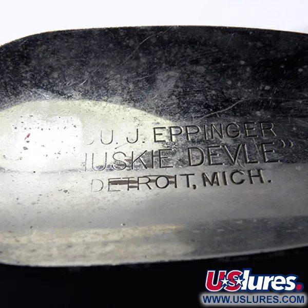 Tämä peräti 3 1/4 oz (91 g) painava järeä lusikkauistin on suunniteltu syvän veden heittokalastukseen tai uisteluun suurille petokaloille. Tämä Eppinger-yksilö, joka tunnetaan nimellä Huskie Devle (tuotekoodi 0245), on pituudeltaan huomattavat 5 1/2" (14 cm). Klassista Puna / Valkoinen -viimeistelyä edessä korostaa valkoisten osien päällä oleva erottuva hunajakennomainen suomukuvio. Vieheen kääntäminen paljastaa stanssatun kromitaustan, jossa on selkeät merkinnät "EPPINGER HUSKIE DEVLE" ja alkuperäpaikka "DEARBORN, MICH.", mikä ajoittaa tämän mallin yrityksen vuoden 1959 muuton jälkeiseen aikaan. Tämän nimenomaisen mallin ainutlaatuinen ominaisuus on takarenkaaseen kiinnitetty pieni keltamaalattu lisälippa, joka on koristeltu punaisilla timanteilla ja ikonisella paholaisen pää -logolla. Varustus on vankka, ja siinä on suuri hopeaviimeistelty kolmihaarakoukku valmiina kovaan käyttöön. Kunnossa 4/5 maali on edelleen kirkas ja metalli säilyttää korkealaatuisen kiillon, mikä osoittaa aikakauden kestävää amerikkalaista käsityötaitoa. Taustapuolen stanssatut yksityiskohdat ovat pysyneet terävinä ja luettavina kiillotettua pintaa vasten.