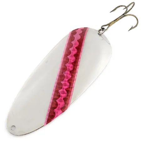 Tämän vankan 58 gramman (2 oz) painoisen lusikkauistimen kiillotettua nikkelipintaa halkoo vinottain omaleimainen aaltoileva puna-vaaleanpunainen raita. Dardevle Huskie Junior 700 -sarjan uistimena tunnettu (tuotekoodi 23288) vankka 11,5 cm (4 1/2") runko on suunniteltu suurten petokalojen pyyntiin uistellen tai raskaalla heittokalastuksella. Vieheen taustapuolella on aito Lou J. Eppinger Detroit, Michigan -leima, joka kertoo sen amerikkalaisesta valmistusperinnöstä. Varustettu suurella ja paksulankaisella kolmihaarakoukulla, joka on kiinnitetty perään kestävällä uistinrenkaalla. Etupuolen heijastava nikkelipinta on säilynyt kirkkaana, ja leimattu taustapuoli on selkeä ja helppolukuinen. Kuntoluokituksella 4/5 tämä yksilö on hyvin säilynyt esimerkki Eppingerin raskaammasta mallistosta, ja se on säilyttänyt kaiken vintage-vieheeltä odotetun rakenteellisen eheyden.
