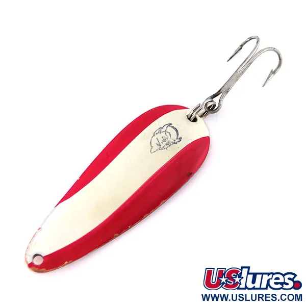 Tämä 11 gramman (2/5 oz) painoinen Eppinger Dardevle Imp, tuotekoodi 10012, on amerikkalaisen kalastushistorian klassikko. Tarkalleen 5,5 cm (2 1/4") pituisessa lusikkauistimessa on ikoninen punavalkoraidallinen kuviointi etupuolella, jota koristaa keskelle leimattu tunnettu pirunpää-logo. Kääntöpuolella on kirkas kuparinen tausta, johon on selvästi leimattu "DARDEVLE IMP U.S.A." osoittamaan alkuperää ja mallia. Tämä yksilö on 5/5-kunnossa, ja sen maali ja metallipinnat ovat säilyneet erinomaisesti. Uistimen varustukseen kuuluu tukeva uistinrengas ja terävä kolmihaarakoukku, valmiina heittoon. Historiallisesti näitä kuparitaustaisia versioita suosittiin usein sameammissa vesissä, joissa lämmin metallinen välke leikkasi veden sameuden läpi. Kovera, pitkänomainen muoto on Lou Eppingerin vuonna 1906 Detroitissa luoman muotoilun tunnusmerkki, vaikka myöhempi tuotanto siirtyi Dearborniin. Koko tekee siitä erittäin monikäyttöisen kevyeen ja keskivaikevyeen kalastukseen hauelle tai ahvenelle. Maalipinta on korkeakiiltoinen, ja takapuolen leimat ovat säilyneet terävinä ja luettavina kuparipinnalla.