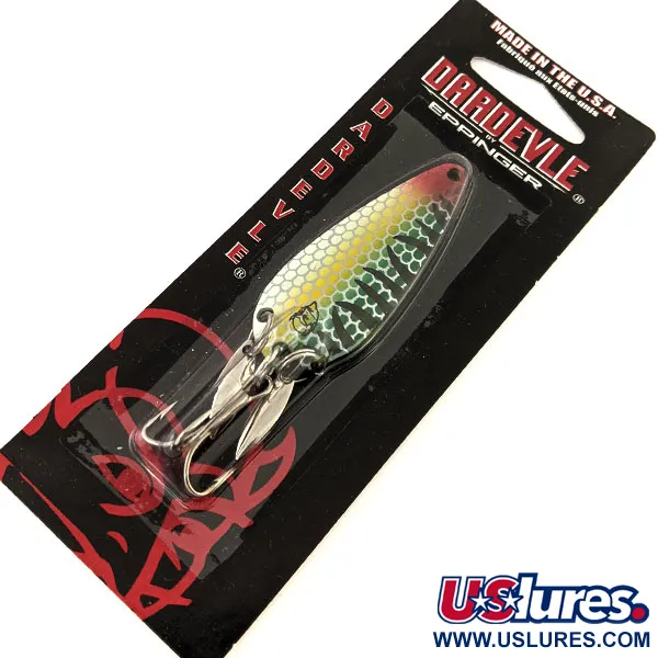 Eppingerin klassiselle Dardevle Imp Klickerille on ominaista eloisa suomukuvioitu pinta, jossa on vihreän, keltaisen ja punaisen sävyjä. Tässä mallissa on tuotekoodi 13099 ja se on käyttämätön, edelleen alkuperäisessä pakkauksessaan. Lusikkauistin on pituudeltaan 5,5 cm (2 1/4") ja painoltaan 11 g (2/5 oz), ja se on vakiintunut valinta ahvenen, taimenen ja lohen kalastukseen. "Klicker"-rakenne erottuu kahdella pienellä äänilevyllä, jotka on kiinnitetty kolmihaarakoukun uistinrenkaaseen. Ne tuottavat mekaanisen äänen osuessaan uistimen runkoon kelauksen aikana. Tässä mallissa on lämmin kuparinen tausta, mikä on erityinen muunnelma näkyvyyden parantamiseksi eri vesiolosuhteissa. Dearbornissa, Michiganissa valmistettu uistin korostaa merkille ominaisia valumuotteja ja amerikkalaisia tuotantostandardeja, jotka ovat määritelleet brändiä vuodesta 1906 lähtien. Värikuviota 59 Black Perch (B) täydentävät meistetty "DARDEVLE"-logo ja kirkkaat hopeanväriset osat.