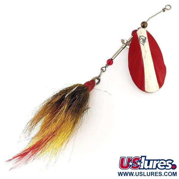 Punavalkoinen raidoitus ovaalissa lehdessä tunnistaa tämän Dardevle JT Buel -vieheen Eppinger-merkin perusvalikoimaan. Tämä 15 gramman (1/2 oz) painoinen ja 12 cm (4 3/4") pituinen viehe, tuotekoodiltaan 12232, sisältää höyhenperän, jossa maanläheiset sävyt yhdistyvät punaiseen välkkeeseen. Punaiset helmet on ladottu teräslankaan toimimaan leikarilenkin välikkeinä ja lisäämään hienovaraista kiinnostavuutta. Lehden kääntöpuolella hopeinen pinta on säilynyt kirkkaana ja siinä näkyvät selvästi stanssatut valmistajatiedot sekä kuuluisa paholaisenpää-logo. Tämä nimenomainen yksilö on poikkeuksellisessa kunnossa, ansaiten 5/5-luokituksen. Pyrstön karvoitus on tuuhea ja sidottu tiukasti punaisella langalla, tarkoituksena antaa kokoa ja profiilia kelauksen aikana. Sen rakenne heijastaa puolivuosisadan takaisen amerikkalaisen kalastustarvikkeen laatua vankalla teräslankaisella rungolla ja tarkasti taivutetulla kiinnityssilmukalla. Klassisen punavalkoisen kuvion, pyörivän lehden ja höyhenkoukun yhdistelmä tekee tästä erikoistuneen muunnelman Dardevle-perheessä.