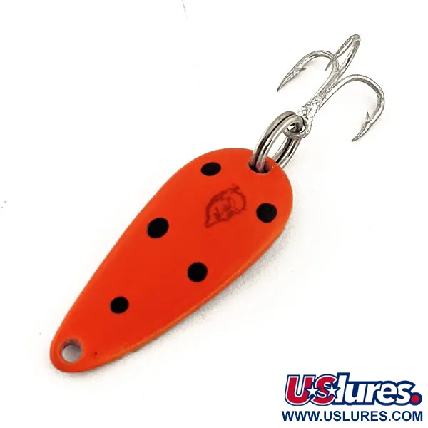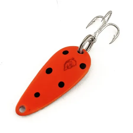 Voimakkaat mustat pisteet erottuvat terävästi tämän 3 cm:n lusikan fluoresoivasta oranssinpunaisesta pinnasta. Ikonisella paholaisenpäälogolla leimattu Eppinger Dardevle Lildevle UV kantaa tuotekoodia 12820. Nikkelinen tausta antaa toissijaisen välkkeen, kun taas erikoismaali hehkuu voimakkaasti UV-valossa – moderni päivitys Michiganin perintöön, joka juontaa juurensa Lou Eppingerin alkuperäisiin malleihin vuodelta 1906. 3,4 g (1/8 oz) painoisena se tarjoaa riittävästi tiheyttä tarkkoihin heittoihin kohti rakenteita tai kalaparvia. Varustukseen kuuluu tukeva uistinrengas ja terävä hopeinen kolmihaarakoukku, jotka molemmat ovat erinomaisessa kunnossa (luokitus 5/5). Eppingerin omat muotit antavat tälle lusikalle sen tunnusomaisen koveran profiilin, joka on säilytetty huolellisesti siitä lähtien, kun yritys muutti Dearborniin vuonna 1959. Lusikan kompakti koko ja erottuva viimeistely tekevät siitä luotettavan valinnan taimenen tai ahvenkalojen pyyntiin erilaisissa olosuhteissa.