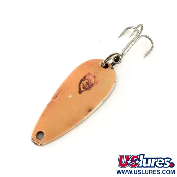 Nikkelinsävyiseen kääntöpuoleen on selvästi stanssattu sanat "DARDEVLE MIDGET U.S.A.", jotka tunnistavat tämän klassisen Eppinger-lusikan. Pituudeltaan 3,5 cm (1 1/2") uistimen etupuoli on viimeistelty lämpimällä Salmon-värillä, ja koveran rungon keskellä on erehtymätön musta paholaisenpää-logo. Tämä 6 g (3/16 oz) painoinen yksilö, tuotekoodiltaan 11724, on säilyttänyt alkuperäiset osansa, mukaan lukien vahvan uistinrenkaan ja terävän, hopeoidun kolmihaarakoukun. Nikkelöity tausta tarjoaa kirkkaan kontrastin värikkäälle etupuolelle, mikä on suunniteltu maksimoimaan näkyvyys eritasoisissa vesissä. Kunnoltaan uistin on 5/5, ollen poikkeuksellisen hienossa kunnossa vintage-vieheeksi; stanssaukset ovat tarkat ja maali kirkas. Näitä lusikoita on valmistettu omilla muoteilla siitä asti, kun Lou Eppinger perusti yrityksen Detroitissa vuonna 1906, kunnes toiminta siirtyi Dearborniin vuonna 1959. Jokainen yksityiskohta, erityisestä pitkänomaisesta muodosta painonjakautumaan, heijastaa yli vuosisadan mittaista amerikkalaista valmistusperinnettä heitto- ja uistelukalastukseen.