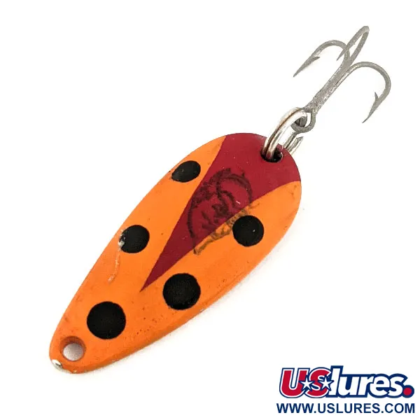 6 g (3/16 oz) painoinen lusikkauistin on monipuolinen valinta kevyeen heittokalastukseen tai uisteluun. Etuosa on viimeistelty kirkkaan oranssilla emalilla, jota koristavat viisi mustaa täplää ja erottuva tummanpunainen vinoraita. Punaisen osan keskellä on klassinen Eppingerin pirunpää-logo, joka on toiminut Michiganilaisen yrityksen perinteikkäänä tunnuksena jo vuodesta 1906. Pituudeltaan 3,5 cm (1 1/2 tuumaa) olevassa lusikassa on kiillotettu nikkelitausta, johon on selkeästi meistetty teksti "DARDEVLE MIDGET U.S.A.". Tuotekoodilla 12829 tunnistettava uistin on erinomaisessa kunnossa (arvosana 5/5), ja sen maalipinta sekä alkuperäiset koukut ovat säilyneet hyvin. Varustukseen kuuluu vakiomallinen uistinrengas ja terävä kolmihaarakoukku tehdasasetusten mukaisesti. Metallin jokainen kaari on muotoiltu valmistajan omilla muoteilla, jotka ovat määritelleet Eppinger-malliston jo sukupolvien ajan.