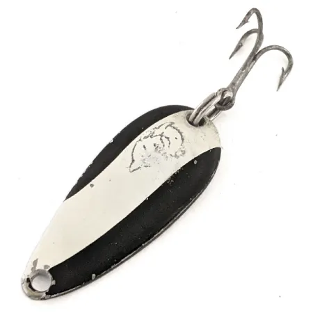 Tämä siro 3/16 unssin (6 g) painoinen vintage-lusikkauistin edustaa Lou Eppingerin Michiganin verstaaltaan kalastusmaailmaan tuomaa käsityötaitoa. Tämän 1 1/2 tuuman (3,5 cm) vieheen etupuolella on selkeä viistoväritys, jossa puhdas valkoinen raita kulkee kahden syvän mustan kentän välissä. Valkoisessa raidassa on näyttävä kohokuvioitu delfiinilogo, joka on hienovarainen osoitus merkin historiallisesta valmistusperinteestä. Vieheen kääntöpuolella kiillotettuun nikkelipohjaan on lyöty "DARDEVLE MIDGET U.S.A." -leima. Tämä nimenomainen yksilö, tuotekoodiltaan 12850, on kunnoltaan 5/5, ja siinä on tallella alkuperäinen kiilto ja terävät maalipinnat. Se on varustettu alkuperäisellä kolmihaarakoukulla ja uistinrenkaalla, valmiina joko vitriiniin tai kevytkalastusvälineisiin. Siimankiinnitysreikä on lävistetty tarkasti kapeaan päähän, mikä korostaa USA:ssa tapahtuvan valmistuksen ja käytettyjen muottien tasalaatuisuutta.