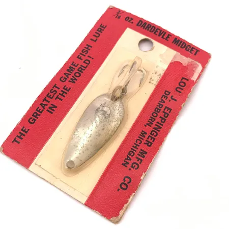 Kiillotettu nikkelipinta viimeistelee tämän 3,5 cm (1 1/2") lusikkauistimen, tarjoten erittäin heijastavan pinnan, jota keräilijät arvostavat sen puhtaan ja klassisen ulkonäön vuoksi. Dearbornista, Michiganista kotoisin olevan Lou J. Eppinger Mfg. Co:n valmistama Dardevle Midget on amerikkalaisen kalastushistorian kulmakivi, ja tuotanto siirtyi Dearbornin toimipisteeseen vuonna 1959. Viehe painaa tarkalleen 6 g (3/16 oz) ja se on kiinnitetty alkuperäiseen puna-valkoiseen taustapahviin, jossa on tuotekoodi 3914. Lusikan etupuolelle on stanssattu valmistajan tavaramerkkinä toimiva pirunpää, mikä on osoitus heidän USA:n tehtaallaan käytetyistä alkuperäisistä meististä. Varustukseen kuuluu terävä kolmihaarakoukku, joka on kiinnitetty kestävällä uistinrenkaalla, ja se on suunniteltu kestämään sekä heittokalastusta että uistelua. Tämä yksilö on käyttämätön ja säilynyt alkuperäispakkauksessaan, jossa on havaittavissa pientä kulumaa ripustusreiän ja kulmien ympärillä.