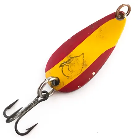 Kääntöpuolen nikkeliviimeisteltyyn metalliin on leimattu "DARDEVLE MIDGET U.S.A." -tunnus, mikä vahvistaa vieheen olevan aito Eppinger-tuote. Pituudeltaan 1 1/2 tuumaa (3,5 cm) ja painoltaan 3/16 oz (6 g), tämä kompakti lusikkauistin on luetteloitu tuotekoodilla 5428. Etupuolella on kirkas punakeltainen vinokuvio, jota koristaa tunnistettava musta pirunpää-logo siimalenkin lähellä. Muotoilussa käytetään Michiganissa kehitettyjä omia muotteja, joilla on luotu heitto- ja uistelukäyttöön tarkoitettu kovera muoto. Varustukseen kuuluu tummasävyinen kolmihaarakoukku ja kestävä uistinrengas takana. Kuntoluokitukseltaan 5/5 oleva yksilö on säilynyt erinomaisesti, ja punainen sekä keltainen väri ovat täyteläiset kiillotettua metallia vasten. Tämä Dardevle-malli luottaa pitkänomaiseen, koveraan muotoonsa, joka tuottaa sille ominaisen huojuvan uinnin kelattaessa.