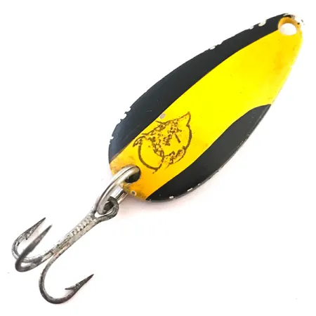Nikkelöityyn taustapuoleen lyöty 'DARDEVLE MIDGET U.S.A.' -merkintä tunnistaa tämän uistimen amerikkalaisen kalastushistorian peruspilariksi. Etupuolella on rohkea musta-keltainen vinokuvio, ja ikoninen paholaisenpää-logo on leimattu selvästi keltaiseen raitaan. Pituudeltaan 3,5 cm (1 1/2") ja painoltaan 6 g (3/16 oz) se on klassinen kevytviehekoko, joka soveltuu useisiin heittotekniikoihin. Eppingerin omat muotit antavat lusikalle sen tunnusomaisen koveran muodon, joka luo sen omaleimaisen vaappuvan uinnin, josta merkki on tunnettu Lou Eppingerin Detroitin ajoista lähtien. Maalipinnassa on hieman kulumaa ja lohkeamia reunoilla, mikä vastaa 4/5-kuntoluokitusta, kun taas kolmihaarakoukku on ehjä ja kiinnitetty tukevalla metallisella uistinrenkaalla. Keräilijät tunnistavat tämän mallin tuotekoodista 5429.