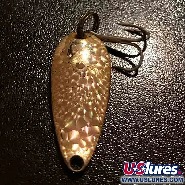 Hakattu "Crystal"-pinta määrittelee tämän Eppinger Dardevle Midget -lusikan visuaalisen ilmeen, heijastaen valoa useista kulmista sen teksturoidun pinnan kautta. Painoltaan 3/16 oz (6 g) ja pituudeltaan 1 1/2" (3,5 cm) tämä lusikkauistin on klassinen valinta taimenelle tai ahvenkaloille kevyillä välineillä. Lusikan kääntöpuolella on selkeästi leimattu tunniste "DARDEVLE MIDGET", joka on Eppinger-tuotemerkin tunnusmerkki. Yritys on toiminut Michiganissa siitä lähtien, kun Lou Eppinger perusti sen vuonna 1906. Tämän erityisen uistimen tuotekoodi on 11800 ja sen kuntoarvio on 4/5. Messinginsävyinen metallirunko on tyypillisen kovera, mikä antaa sille sen ominaisen liikkeen vesipatsaassa. Sen kolmihaarakoukku on kiinnitetty tukevalla uistinrenkaalla yläosaan. Vaikka Eppinger siirsi tuotannon Detroitista Dearborniin vuonna 1959, valmistusprosessissa käytetään edelleen alkuperäisiä muotteja näiden amerikkalaisten lusikoiden erityisen geometrian säilyttämiseksi. Kuperan puolen "Crystal"-kuvion on tarkoitus rikkoa heijastuksia, tarjoten erilaisen välkkeen verrattuna monista vintage-pakeista löytyviin sileäkylkisiin Dardevle-malleihin.