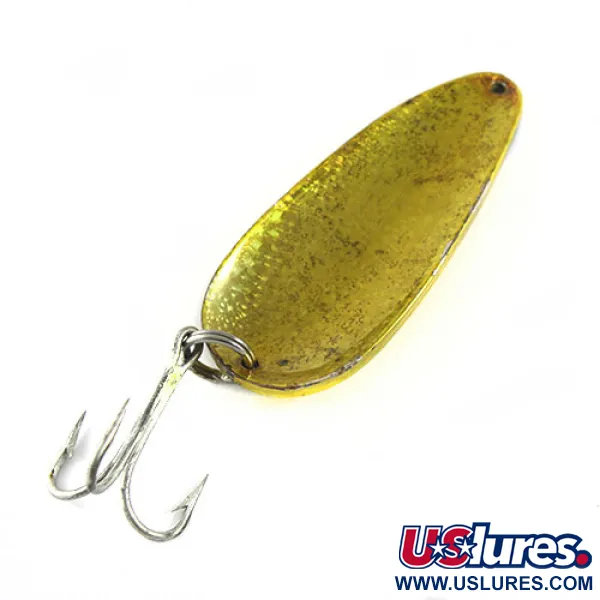 Vasaroitu kultapinta kimaltelee tämän vintage-yksilön pinnalla korostaen klassista Crystal Golden Crystal -värikuviota. Pituudeltaan 7 cm (2 3/4") ja painoltaan huomattavat 36 g (1 1/4 oz), tämä Dardevle Rok't Devle on suunniteltu pitkiin heittoihin ja syvälle uimiseen. Eppinger on valmistanut näitä lusikoita vuodesta 1906 lähtien käyttäen omia muottejaan luodakseen ikonisen koveran profiilin, joka teki niistä vakioasusteen Michiganin kalastuspakkeihin ja jopa sotilaallisiin selviytymispakkauksiin. Tämän nimenomaisen uistimen, tuotekoodi 0651, etupuolelle on lyöty "ROK'T"-merkintä. Metallipinnassa on lieviä merkkejä sen iästä muutamina pieninä tummina täplinä, mutta se säilyttää kauniin kiillon, joka ansaitsee kuntoarvosanan 4/5. Se on varustettu suurella, alkuperäisellä hopeanvärisellä kolmihaarakoukulla, joka on kiinnitetty vankalla uistinrenkaalla, ja siinä on yksi siiman kiinnitysreikä kapenevassa päässä.