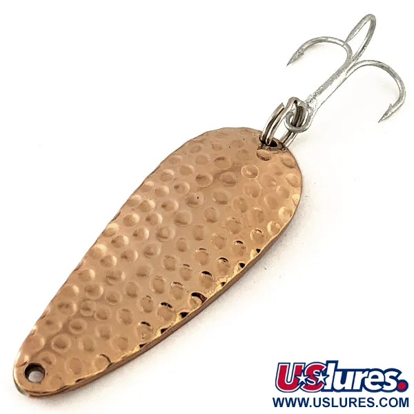 Tämä Eppinger-lusikka on leimattu ikonisella ”DARDEVLE IMP U.S.A.” -merkinnällä sen sileälle kääntöpuolelle, ja se edustaa michiganilaisen valmistajan ajatonta käsityötaitoa. Painoltaan 21 g (3/4 oz) ja pituudeltaan 5,5 cm (2 1/4") olevassa uistimessa on erottuva vasaroitu kupariviimeistely sen kuperalla puolella, mikä luo teksturoidun pinnan, joka heijastaa valoa useista eri kulmista. Tämä yksilö, tuotekoodiltaan 12146, on erinomaisessa 5/5-kunnossa, ja siinä on puhdas, kirkas metallipinta ja terävät koukut. Vieheen etuosaa hallitsee tasainen kuviollinen pinta, kun taas takaosa on kiillotettu ja siinä näkyy selvästi valmistajan merkki. Tukevaan uistinrenkaaseen kiinnitetty hopeanvärinen kolmihaarakoukku on kulumaton. Tämä Rok't Imp -malli on valmistettu Eppingerin omilla muoteilla noudattaen Lou Eppingerin luomaa tarkkaa profiilia heitto- ja uistelukalastukseen.