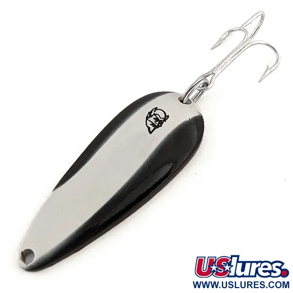 Tämän lusikkauistimen messinkiseen taustapuoleen on selvästi lyöty merkintä "ROK'T-DEVLE IMP. DEARBORN MICH.", mikä kertoo sen valmistushistoriasta Eppingerin vuoden 1959 muuton jälkeen. Kooltaan uistin on 5,5 cm (2 1/4") ja painoltaan 21 g (3/4 oz). Siinä on korkeakontrastinen jaettu viimeistely: toinen puoli on umpimusta ja toinen kiillotettua metallinhohtoista hopeaa, jossa on ikoninen musta paholaisenpää-logo. Tämä väriyhdistelmä, tuotekoodi 13136, on suunniteltu heittokalastukseen, ja sen klassinen kovera pisaramuoto luo uistimelle ominaisen vastuksen vedessä. Tämä yksilö on käyttämätön ja erinomaisessa kunnossa (arvosana 5/5). Maalipinta on terävä ja messinkinen tausta on puhdas alkuperäisessä metalliviimeistelyssään ilman käytön jälkiä. Uistin on varustettu yhdellä suurella kolmihaarakoukulla ja tukevalla uistinrenkaalla. Siitä lähtien, kun Lou Eppinger aloitti näiden käsinvalmistuksen Detroitissa vuonna 1906, Dardevle-malliston muotit ovat säilyttäneet tietyn geometrian, jonka keräilijät tunnistavat heti. Tämä kappale on hyvin säilynyt esimerkki amerikkalaista kalastushistoriaa Dearbornin tehtaalta Michiganista.